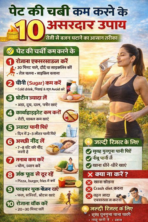 अगर आप भी पेट की चर्बी से परेशान हैं, तो इस आर्टिकल में बताए गए 10 असरदार उपाय अपनाकर आप आसानी से इसे कम कर सकते हैं।